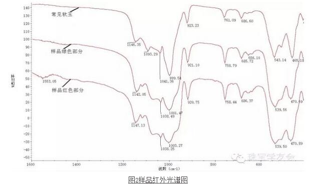 利用傅里叶变换红外光谱仪(NICOLET IS5型)对样品进行测试,测试条件:分辨率4cm-1,测量范围400-1600cm-1,扫描32次。取样品中褐红色部位及绿色部位和最常见青玉红外图谱比较(图2),基本吻合。