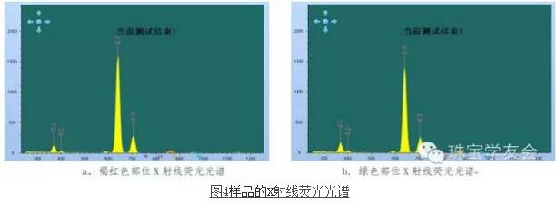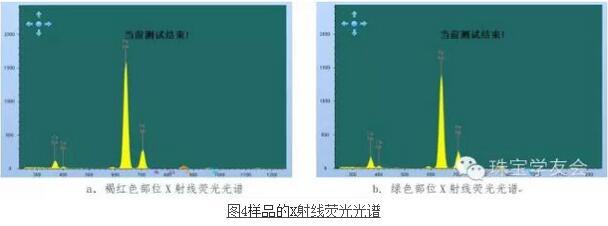 采用天瑞EDX3000PLUS型X射线荧光光谱仪进行测试,在相同测试条件下对样品褐红色部位和绿色部位进行测试,测试结果(图4)表明,样品褐红色部位与绿色部位铁含量较高(褐红色部位含铁量稍高一点),由此推测两个部位的致色元素都为铁(Fe)元素。
