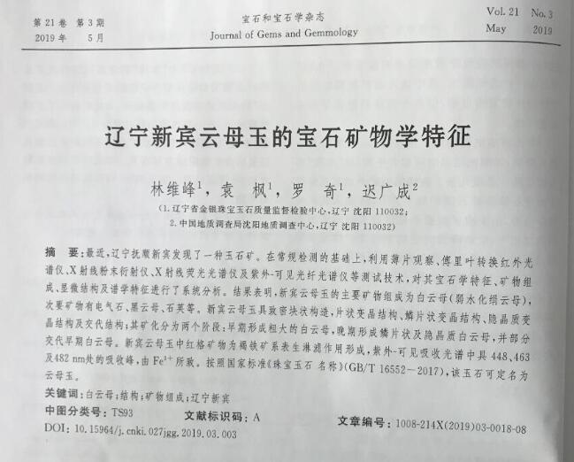 近期,我中心林维峰、袁枫、罗奇等研究人员在国家核心级期刊《宝石和宝石学杂志》2019年第三期上成功发表《辽宁新宾云母玉的宝石矿物学特征》论文。