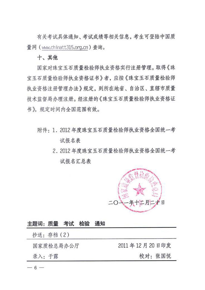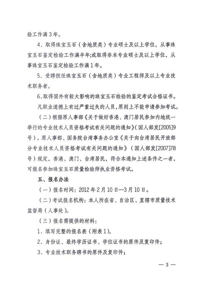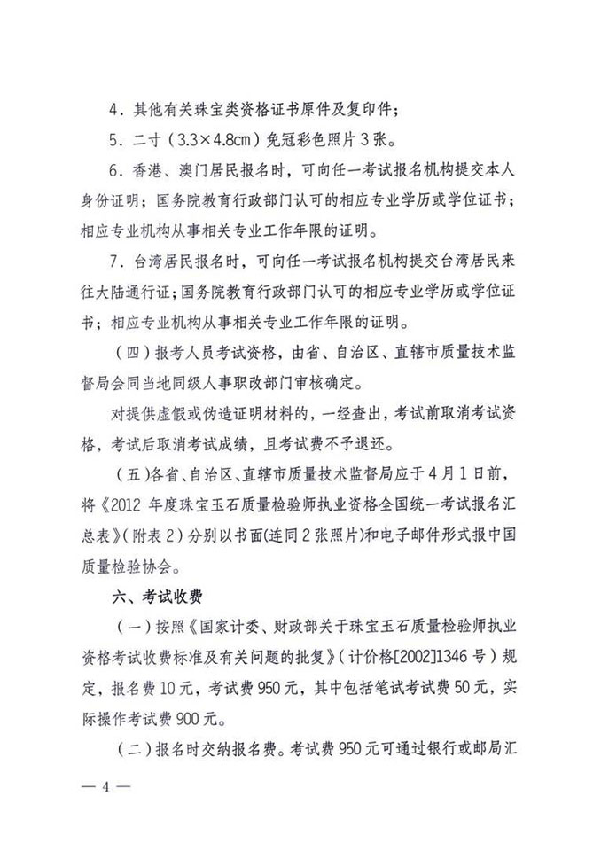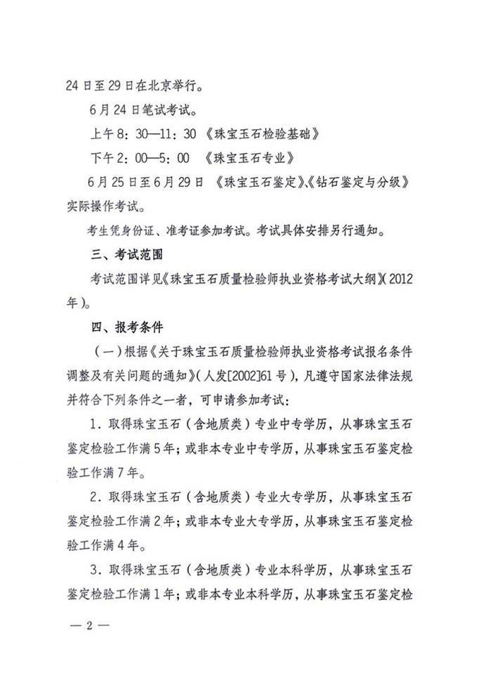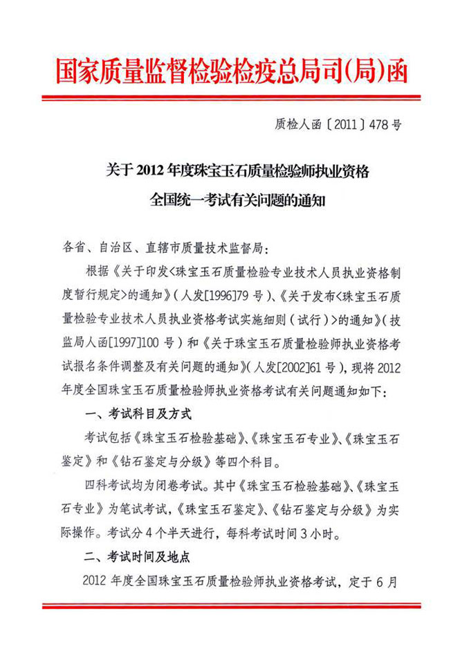 关于2012年全国珠宝质检师职业资格统一考试的通知